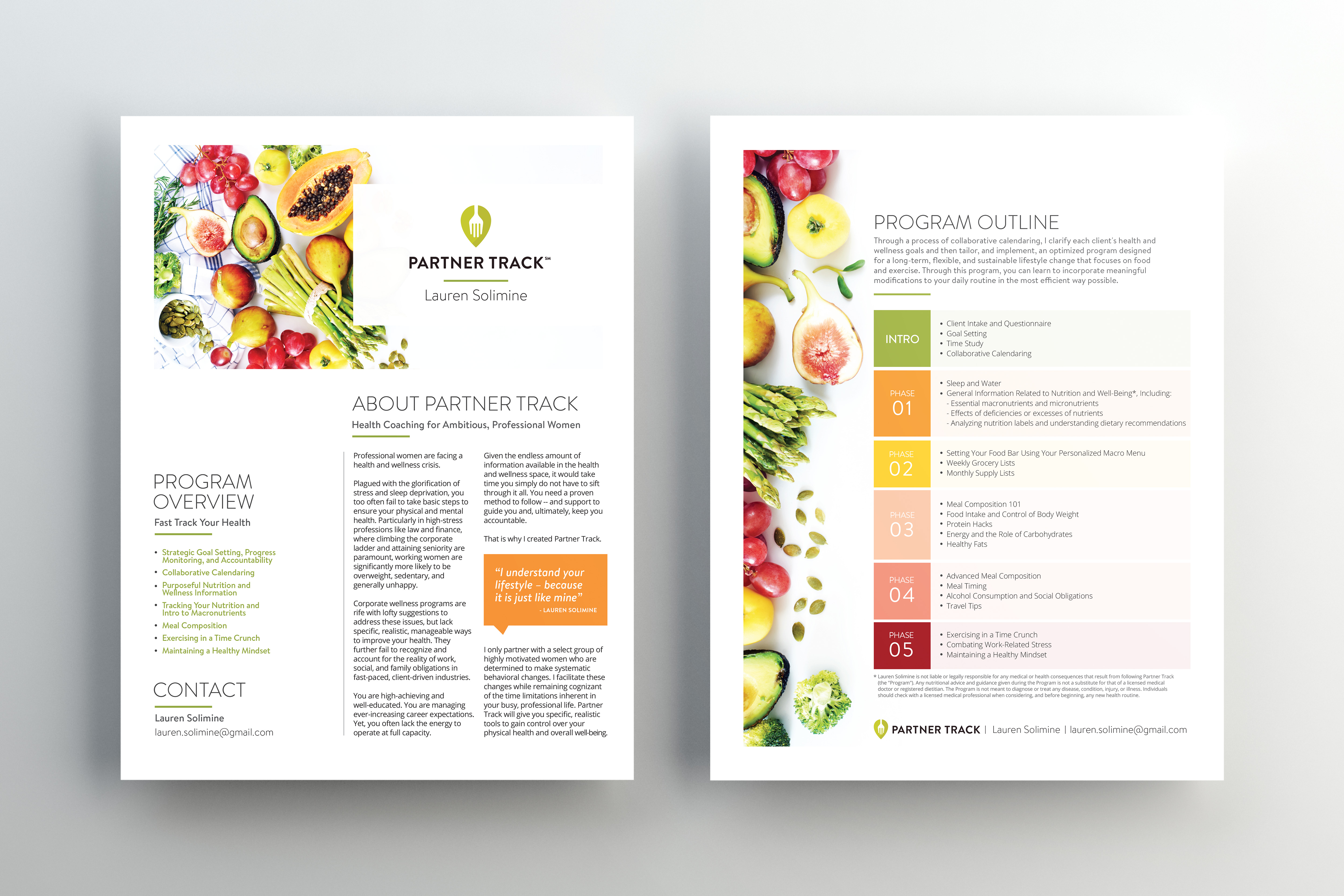 Partner track is a health coaching service for ambitious, busy professional women. The client needed a brochure to explain their services, logo and business cards to launch her business.